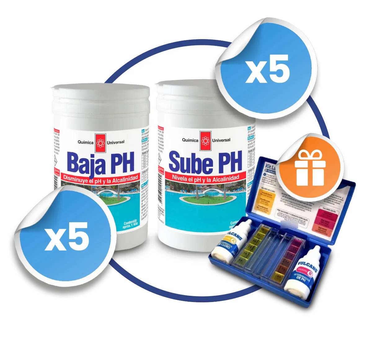 KIT 5 UND. SUBE PH Y 5 UND. BAJA PH QUÍMICA UNIVERSAL + REGALO TESTER MEDICIÓN