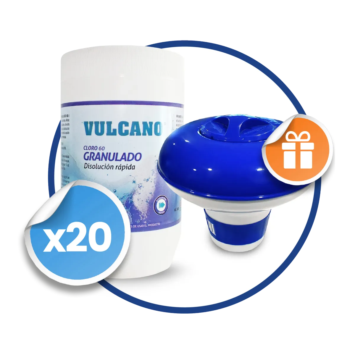PACK 20 UND. CLORO GRANULADO 60% 1KG + REGALO BOYA DOSIFICADORA VULCANO